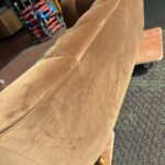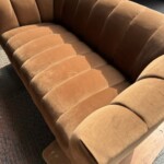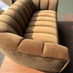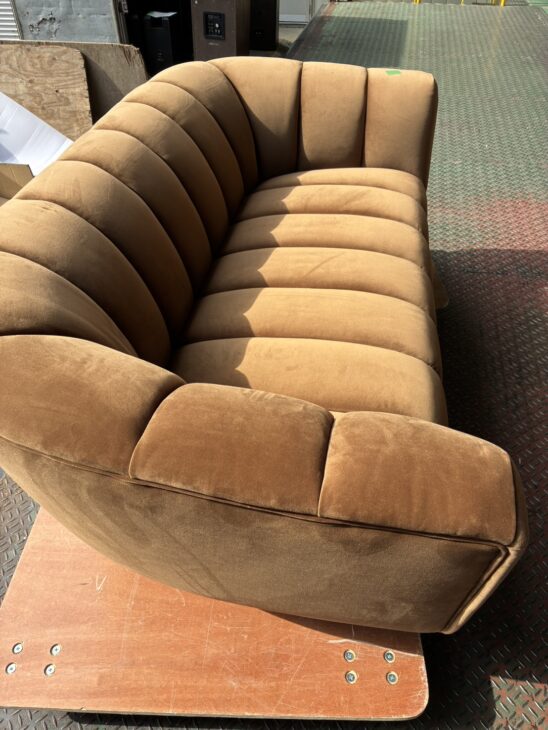 お引き取りしたソファは、やわらかなベルベット調ファブリックと曲線的なデザインが特徴的なモデルです。座面・背面ともに大きなへたりはなく、クッションの弾力もしっかり保たれていました。表面には使用に伴う軽微な擦れや色ムラ、背面側に若干のスレ跡が確認できましたが、破れや深い汚れは見られません。脚部やフレームのぐらつきもなく、家具として十分に再利用可能なコンディションでした。