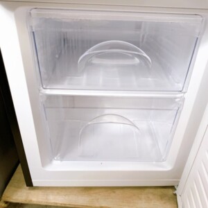 お引き取りした冷蔵庫は、外装に使用に伴う軽微な汚れや細かな擦れが見られるものの、大きな凹みや破損はなく全体的に良好な状態でした。庫内は清潔に保たれており、棚板やドアポケット、冷凍ケースの割れや欠損もありません。通電確認では冷却機能も正常に作動し、温度調整ダイヤルの動作も問題ありませんでした。