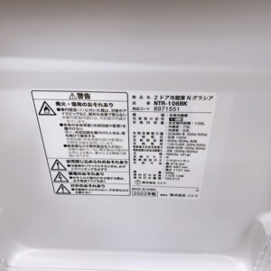 今回は多摩市にお住まいの40代女性・主婦・夫婦世帯・持ち家マンションのお客様より、ニトリ 2ドア冷蔵庫 NTR-106BK(2022年製)を出張買取にてご依頼いただきました。