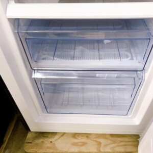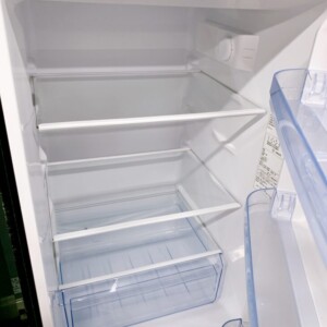 本体外装はステンレス調の前面パネルに目立つキズやへこみはなく、全体的に良好なコンディションでした。庫内は棚板・ドアポケット・野菜ケース・冷凍ケースともに汚れやニオイ移りが少なく清潔な状態を保っており、使用期間の短さがうかがえます。冷却動作も確認済みで、冷蔵・冷凍ともにしっかり機能していました。付属パーツも揃っており、再販時の評価が高い状態です。