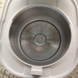 外観は光沢のあるホワイトボディで、日常使用に伴う軽微な擦れはあるものの目立つ傷や変色は見られませんでした。内釜のコーティング状態は良好で、大きな剥がれや焦げ付きはなく清潔な印象です。内ぶたや加熱プレート周辺も汚れが少なく、正常に加熱・炊飯動作を行うことを確認しました。しゃもじが付属しており、すぐに使用できる状態でした。