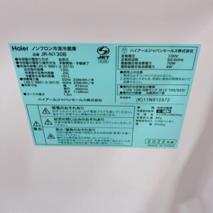 JR-N130Bはコンパクト冷蔵庫の中でも需要が高く、単身世帯やセカンド冷蔵庫用途として中古市場で安定した人気があります。2022年製と比較的新しく、庫内の清潔感と動作状態の良さが評価ポイントとなりました。外装に軽微な使用感は見られるものの再販需要が見込めるため、今回は2,500円でのお買取りとなりました。