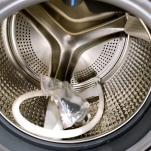本体外観には使用に伴う擦れや汚れの付着、細かな傷が見受けられましたが、大きな破損はありませんでした。操作パネルや扉部分も動作に問題はなく、ドラム内部は比較的清潔な状態でした。付属品として給排水ホース一式が揃っており、動作確認でも洗濯・乾燥ともに正常に作動することを確認しました。
