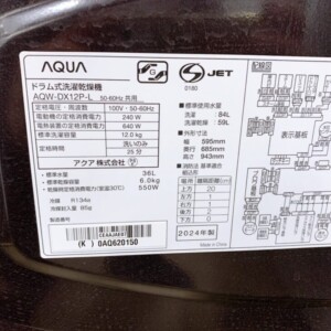 今回は練馬区にお住まいの40代女性・会社員(夫婦世帯/分譲マンション)より、AQUA ドラム式洗濯乾燥機 AQW-DX12P-L(2024年製)の出張買取をご依頼いただきました。