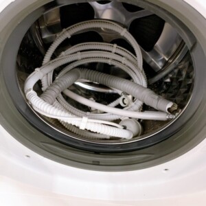 本体外観は白色ボディ特有の軽微な擦れや薄い汚れが確認できましたが、大きな傷や破損は見られませんでした。操作パネルやドア周辺も良好な状態で、内部ドラムは清潔感があり使用感は比較的少なめです。付属品として給排水ホース類が揃っており、洗濯・乾燥機能ともに正常動作を確認しました。
