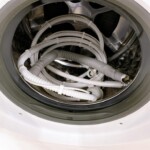 本体外観は白色ボディ特有の軽微な擦れや薄い汚れが確認できましたが、大きな傷や破損は見られませんでした。操作パネルやドア周辺も良好な状態で、内部ドラムは清潔感があり使用感は比較的少なめです。付属品として給排水ホース類が揃っており、洗濯・乾燥機能ともに正常動作を確認しました。