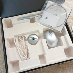お預かりしたペンタブレットは本体に目立つダメージが少なく、使用感も軽微な良好状態でした。タブレット表面は比較的きれいで動作確認も問題なし。ペン、マウス、接続ケーブル、ソフトウェアディスク、説明書など付属品が揃っており、元箱も残っている状態でした。箱には保管に伴う擦れが見られますが、本体のコンディションには影響ありません。