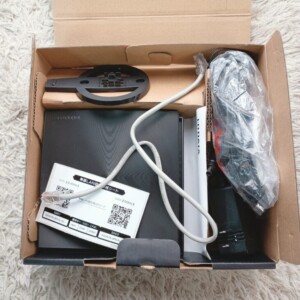 お預かりした無線LANルーターは、外装に目立つキズや破損がなく使用感の少ないきれいな状態でした。本体の動作確認も問題なく、通電および通信機能は良好です。さらにスタンド、ACアダプター、LANケーブル、設定カード、元箱が揃っており、再販時の評価が高くなる付属品完備の状態でした。