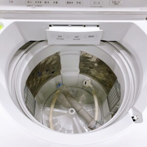 拝見した洗濯機は外装に目立つキズやへこみがなく、全体的に清潔感のある良好なコンディションでした。操作パネル表示や各ボタンの反応も正常で、洗濯・すすぎ・脱水の動作確認も問題ありません。洗濯槽内部もサビや強い汚れは見られず、糸くずフィルターや給排水ホースも揃っており、そのまま再使用できる状態でした。