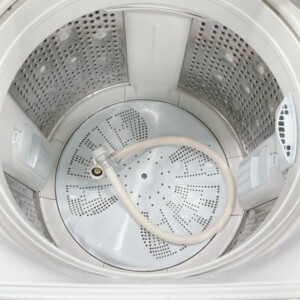 本体外観には日常使用に伴う擦れや小キズ、軽度の汚れが見られましたが、大きなへこみや破損はありませんでした。洗濯槽内部は清潔な状態が保たれており、嫌なニオイやカビの付着も見受けられません。給水・排水ホースも付属しており、動作確認では洗い・すすぎ・脱水ともに問題なく作動しました。外観に使用感はあるものの、実用面では良好な状態でした。