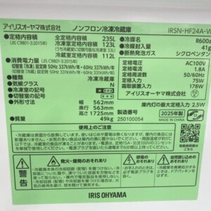 今回は国分寺市にお住まいの40代女性会社員・夫婦世帯・持ち家(分譲マンション)にお住まいのお客様より、アイリスオーヤマ ノンフロン冷凍冷蔵庫 IRSN-HF24A-W(2025年製)を出張買取にてご依頼いただきました。