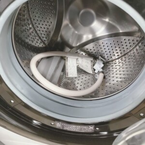 庫内ドラム部分は比較的きれいな状態で、ステンレス槽に目立つサビや汚れはありませんでした。給水ホースも付属しており、基本的な付属品は揃っています。ドア周辺の外装には使用に伴う細かな擦れが見られましたが、大きな割れやへこみはなく、動作確認でも洗い・脱水・乾燥機能ともに正常に作動しました。