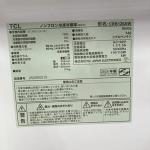 今回は新宿区神楽坂にお住まいの30代女性より、TCL ノンフロン冷凍冷蔵庫 CRB126AW(2025年製)を出張買取にてご依頼いただきました。