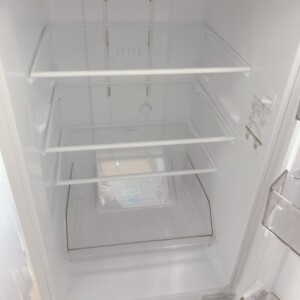 拝見した冷蔵庫は外観・庫内ともに非常にきれいな状態で、目立つキズやヘコミ、変色は見受けられませんでした。棚板やドアポケット、製氷トレーなどの付属パーツもすべて揃っており、庫内のニオイや汚れもほとんどない清潔な状態でした。使用期間が短く、動作も問題なく良好であることを確認しました。