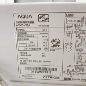 福島県北塩原村へAQUA AQW-V7M 全自動電気洗濯機を出張買取 使用感の少ない美品のため適正価格で査定しました