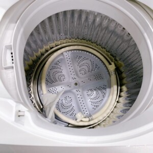 本体外観は光沢が保たれており、目立つキズやへこみは見られませんでした。操作パネル表示も鮮明でボタン反応も良好です。内槽はステンレス部分にくすみが少なく、糸くずフィルター周辺の汚れも軽微で清潔感のある状態でした。給水ホースなどの基本付属品も揃っており、使用感の少ない良好なコンディションで再使用に適した状態でした。