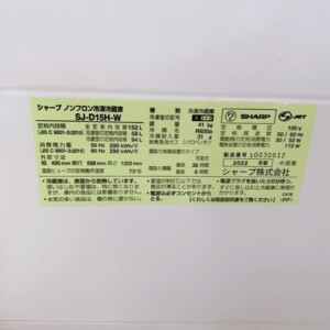 今回は足立区にお住まいの30代男性・会社員・単身世帯・賃貸(マンション)にお住まいの方より、SHARP ノンフロン冷凍冷蔵庫 SJ-D15H-W(2022年製)を出張買取にてご依頼いただきました。