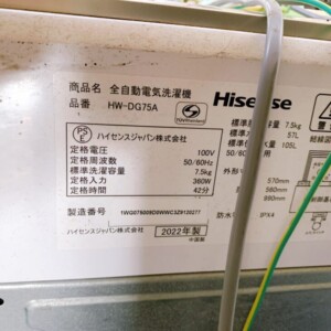 今回は板橋区にお住まいの40代男性・会社員(単身世帯/賃貸マンション)より、Hisense 全自動電気洗濯機 HW-DG75A(2022年製・7.5kg)を出張買取にてご依頼いただきました。