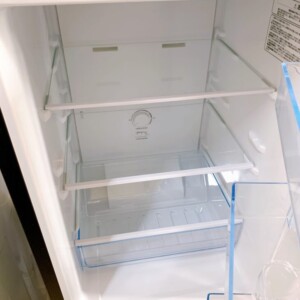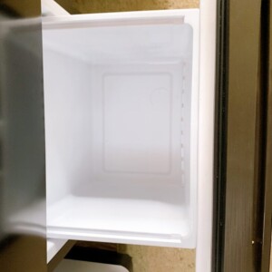 本体外装はダークカラー特有の使用に伴う擦れ跡やくもり汚れが見受けられましたが、目立つヘコミや破損はありませんでした。庫内は棚板・ドアポケット・野菜ケースともに割れや欠品はなく、清掃も行き届いており衛生的な状態でした。冷却動作も問題なく、冷蔵・冷凍ともにしっかり冷えることを確認。実用性の高いコンディションを保っている一台です。