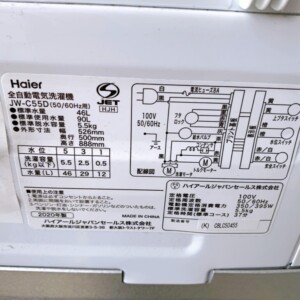 拝見したJW-C55Dは動作確認済みで洗い・すすぎ・脱水ともに問題なしの状態でした。槽内は使用感が少なく、目立つカビや強いにおいもありません。外装には日常使用に伴う軽微な擦れが見受けられましたが、大きなへこみや割れはなく全体的に良好です。給水ホース・排水ホース・取扱説明書も揃っており、次のご使用者様にも安心してお渡しできる内容でした。