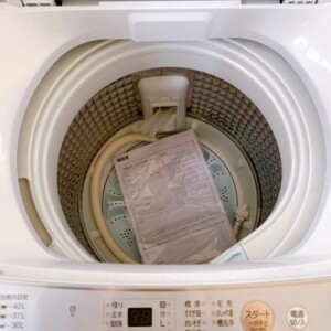 本体外装には日常使用による軽微な汚れや擦れが見られましたが、目立つヘコミや破損はありませんでした。洗濯槽内は清潔な状態を保っており、動作確認では洗い・すすぎ・脱水まで問題なく稼働しました。給水ホースが付属しているほか、取扱説明書も揃っているため、再使用時も安心できる状態です。