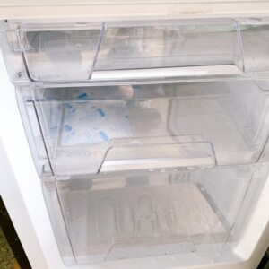 拝見した冷蔵庫はブラックカラーの外装に使用に伴う擦れやくもり跡、軽微な汚れが見受けられましたが、大きなヘコミや破損はありませんでした。庫内は棚板・ドアポケットともに破損はなく、野菜ケースや冷凍室の引き出しも揃っている状態です。庫内の冷却動作も正常で、日常使用に問題のないコンディションでした。