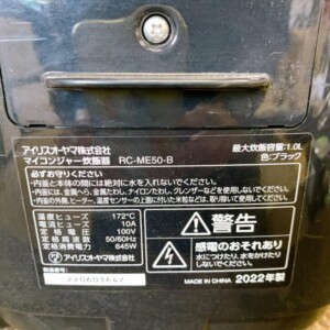 今回は目黒区自由が丘にお住まいの30代女性・会社員(単身世帯)より、アイリスオーヤマ マイコンジャー炊飯器 RC-ME50-B(2022年製)を出張買取にてご依頼いただきました。