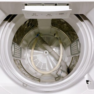 本体外装には目立つキズやへこみは見られず、全体的に清潔感のある状態でした。フタ部分の透明窓や操作パネルも視認性が良く、日常使用による軽微な擦れがある程度です。洗濯槽内部は汚れやカビの付着が少なく、糸くずフィルターや給排水ホースも揃っていました。洗い・すすぎ・脱水の各動作確認も問題なく、再販に適した良好なコンディションと判断いたしました。