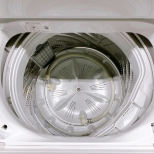 本体外装には目立つ傷やへこみはなく、白いボディの光沢も保たれている清潔感のある状態でした。フタや操作パネル周辺も良好で視認性に問題はありません。洗濯槽内部は汚れやカビの付着が見られず、糸くずフィルターや給水ホースも揃っていました。洗い・すすぎ・脱水の動作確認も正常で、使用感の少ない美品コンディションと判断いたしました。