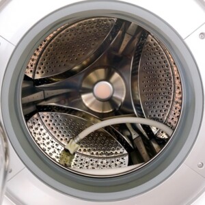 本体外装は目立つ傷やへこみが見られず、光沢のあるホワイトボディが保たれた清潔感のある状態でした。ドア部分のスモークガラスも曇りや大きな傷はなく、操作パネルの表示や各ボタンの反応も良好です。ドラム内部はステンレス槽の輝きが残っており、汚れやカビの付着はほとんど確認できませんでした。給水ホースなどの付属品も揃っており、洗濯から乾燥までの動作確認も問題なく、使用期間の短さがうかがえる良好なコンディションと判断しました。
