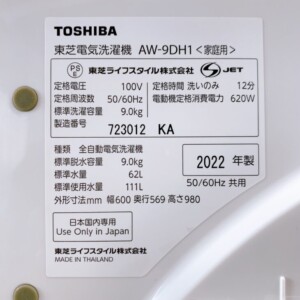 今回は東京都中央区日本橋にお住まいの40代女性(会社員・単身・賃貸マンション)より、東芝 全自動電気洗濯機 AW-9DH1(2022年製・9.0kg)を出張買取にてご依頼いただきました。