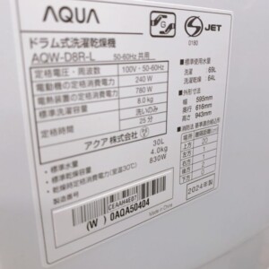 東京都世田谷区等々力へ出張買取 AQUA AQW-D8R-L ドラム式洗濯乾燥機 2024年製 美品のため高価査定しました