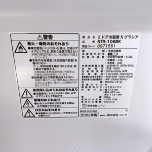 今回は千代田区丸の内にお住まいの30代男性・会社員(単身世帯)より、ニトリ 2ドア冷蔵庫 Nグラシア NTR-106BK(2022年製)の出張買取をご依頼いただきました。