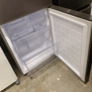 本体外観には使用に伴うわずかな擦れ傷が見受けられましたが、大きく目立つ凹みや塗装剥がれはなく全体として丁寧に使用されていた印象です。庫内は清掃が行き届いており、棚板・ドアポケット・ケース類も揃っており清潔感のある良好なコンディションを保っています。冷却動作も確認でき、冷蔵・冷凍ともに安定した冷えを維持していました。