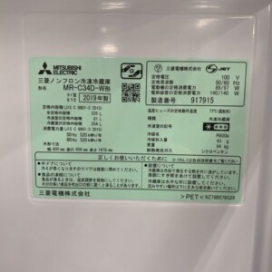 東京都西東京市へ 三菱 MR-C34D-W 冷凍冷蔵庫 2019年製 年式の割に美品のため適正価格で査定しました