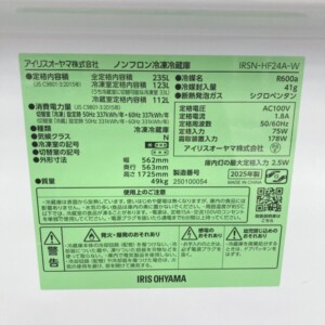 今回は武蔵野市にお住まいの30代男性(会社員・単身世帯)より、アイリスオーヤマ ノンフロン冷凍冷蔵庫 IRSN-HF24A-W(2025年製)を出張買取にてご依頼いただきました。