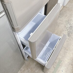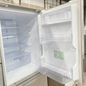 お引き取りしたSJ-W357J-Nは、落ち着いたシャンパンゴールド系カラーが特徴の350Lクラス冷凍冷蔵庫です。外装には目立つへこみや大きな傷は見られず、全体的にきれいな状態でした。庫内の棚板やドアポケット、野菜室・冷凍室の引き出しも割れや欠損はなく、使用に伴う軽微なスレがある程度です。動作確認では冷却機能、庫内灯ともに問題なく、異音も確認されませんでした。2022年製と比較的新しい年式である点も評価対象となりました。