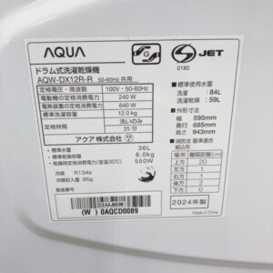 今回は八王子市にお住まいの40代女性・主婦(夫婦世帯・持ち家〈一戸建て〉)より、AQUA ドラム式洗濯乾燥機 AQW-DX12R-R(2024年製)を出張買取にてご依頼いただきました。