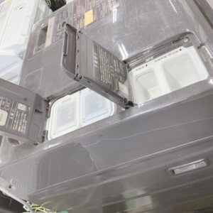 お引き取りしたES-X12C-TRは、洗濯容量12.0kg・乾燥容量6.0kgの大容量モデルで、ヒートポンプ乾燥を搭載した上位クラスのドラム式洗濯乾燥機です。外観はダーク系カラーで高級感がありますが、天板部分に細かな擦り傷や拭き跡が見受けられました。前面ドアには目立つ割れや大きな打痕はなく、槽内も写真の通り比較的きれいな状態です。洗剤投入部や乾燥フィルター部分も破損はなく、動作確認では洗い・脱水・乾燥まで正常に作動しました。2024年製と高年式である点は大きなプラス査定要素です。