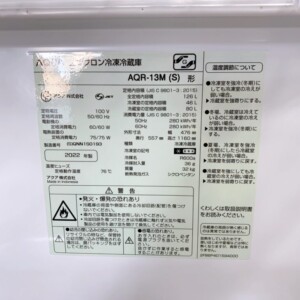 冷蔵庫AQR-13Mは126Lクラスのコンパクトモデルで単身者やセカンド冷蔵庫として中古市場で安定した需要があります。2022年製と比較的新しく動作良好・付属品完備・庫内美品という条件が揃っていたことから再販価値が高いと判断しました。動作確認を徹底し、再流通までの管理体制を整えているため今回は4500円での買取価格をご提示いたしました。