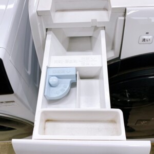 本体側面の製品ラベルより2023年製であることを確認しました。洗濯容量7.0kg、乾燥容量3.5kgのコンパクトドラムモデルで、マンションにも設置しやすいサイズ感が特長です。外観は大きなキズやヘコミは見受けられず、操作パネルの文字消えもありません。ドラム内部は比較的きれいで、ステンレス槽に目立つサビや汚れはありませんでした。内部には給水ホースや取扱説明書類が保管されており、付属品が揃っている点も評価ポイントとなりました。洗剤投入口には軽微な使用感が見られましたが、ベタつきは少なく清潔感のある状態です。通電後に洗い・すすぎ・脱水・乾燥の動作確認を行い、異音やエラー表示はなく正常に稼働しました。