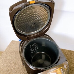 本体外観はブラウンカラーで、天面や側面には使用に伴う薄い擦れ傷や汚れがあり、また内釜付近にも使用に伴う水垢汚れ等がありました。パッキン部分は劣化や破損は確認されず、動作については加熱・保温の確認も問題なくまだまだ使用出来るコンディションでした。