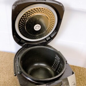お預かりしたRZ-BC10Mは炊飯容量1.0L(5.5合炊き)のIHタイプ炊飯器です。本体外装のステンレス部分には細かな擦れや使用に伴う小傷が見受けられました。内釜は大きな剥がれはありませんが、底面に使用による薄いキズや軽微な汚れが確認できました。内ぶた部分にも水滴跡や取り切れない水垢が見られ、全体として一定の使用感はある状態です。ただし通電確認および基本動作は問題なく、ボタン操作や表示パネルも正常に反応しておりました。