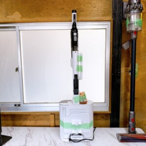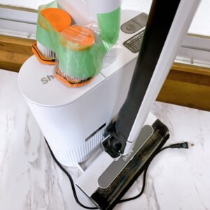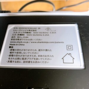 お預かりしたShark製コードレスクリーナーは、ホワイトカラーのスタイリッシュなモデルで、自動ゴミ収集機能を搭載したドック付きタイプです。写真からも分かる通り、本体外観は目立つ傷やへこみがなくきれいな状態でした。ヘッド部分の透明カバーにも大きな割れは見られず、ローラー部分も比較的良好です。