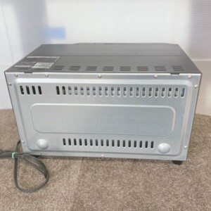 お預かりしたEQ-AG22は、1000W出力・上下ヒーター搭載のスタンダードモデルです。温度調節ダイヤルとタイマーが独立しており、トーストやグラタンなど幅広い調理に対応する仕様です。外装はブラックカラーで、天面や側面に細かな擦れが見受けられます。庫内は使用に伴う焦げ付きや焼き網周辺の汚れが確認でき、トレーにも若干の変色がありました。通電確認ではヒーターの発熱、タイマー動作ともに問題なく、通常使用には支障のない状態です。付属のトレーは揃っておりましたが、元箱や説明書はございません。
