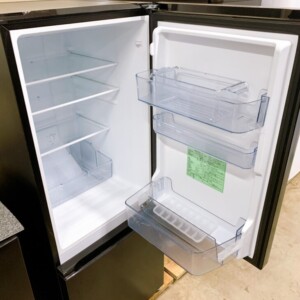 お品物は全定格内容積159L(冷蔵室114L/冷凍室45L)の2ドアタイプで、単身から二人暮らしにも対応できる容量帯のモデルです。外観はブラックカラーで、正面に光の加減で分かる程度の薄い擦れは見られましたが、目立つへこみや塗装剥がれはありません。庫内のガラス棚・ドアポケット・冷凍引き出しも破損や割れはなく、使用感はごくわずかでした。通電確認の結果、冷却機能も正常で異音も確認されませんでした。
