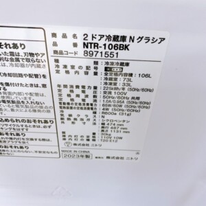 今回は東京都世田谷区等々力にお住まいの30代女性・主婦・夫婦世帯・持ち家(一戸建て)のお客様より、ニトリ 2ドア冷蔵庫 NTR-106BK(106L/2023年製)を出張買取にてご依頼いただきました。