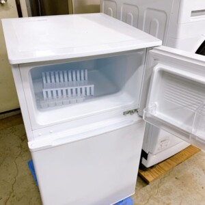 本製品は90Lのコンパクトな2ドアタイプで、ワンルームや学生向け物件で需要の高いサイズです。外観には扉下部や側面に軽微な汚れが見受けられましたが、目立つへこみや大きな傷はありませんでした。庫内は棚板・ドアポケットともに割れや欠けはなく、全体的にきれいな状態です。におい移りもなく、冷蔵・冷凍ともに正常に冷えることを確認しました。付属品もすべて揃っていました。