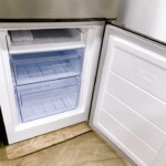 外装はシルバーカラーで、大きなへこみや目立つ塗装剥がれは見受けられません。使用に伴うごく薄い擦れはあるものの、全体としてきれいな状態です。庫内も棚板やドアポケットの割れはなく、冷凍室の引き出しもスムーズに開閉可能。製造ラベルより2023年製であることを確認し、冷却動作・庫内灯の点灯も問題ありませんでした。付属の棚・ケース類も揃っています。