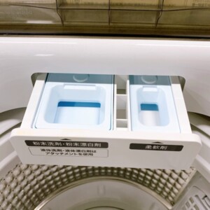 洗濯槽内も写真の通り大きな汚れやカビの付着は見られず、パルセーター周辺もきれいに保たれていました。洗剤投入口も破損や割れはなく、動作確認では給水・洗い・脱水まで問題なく作動することを確認しています。